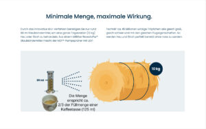 RevestoPur® is a dust-binding agent developed by RRNO-Research. It is designed for use on hay or bedding through the ULV method (ULV stands for ultra-low volume). RevestoPur is preferably applied using the MDF system. MDF stands for “magic dust-free,” a process patented by RRNO (Patent50200DE / Int. PCT/DE2020/100061). Alternatively, It No. 20200131132 can be applied using an easy-to-use and affordable handheld sprayer, which also operates via the ULV method.